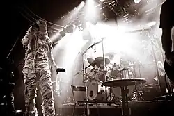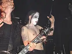 After two brief replacements, the roles of vocalist and drummer in Mayhem were filled by Swedish vocalist Pelle Yngve Ohlin ("Dead") and local drummer Jan Axel Blomberg ("Hellhammer"). With Dead, the band's concerts gained notoriety for their extreme theatricality and atmosphere. From the outset of his career, Dead was known for wearing "corpse paint", involving the application of black and white makeup to achieve a ghastly appearance. According to Necrobutcher, "it wasn't anything to do with the way Kiss and Alice Cooper used makeup. Dead actually wanted to look like a corpse. He didn't do it to look cool."[16] Hellhammer asserted that Dead was "the first black-metal musician to use corpse paint."[17] To complete his corpse-like image, Dead would bury his stage clothes and dig them up to wear on concert nights.[18][19]