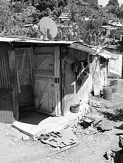 The department faces enormous challenges. According to an Institut national de la statistique et des études économiques (National Institute of Economic Statistics Studies of France – INSEE) report published in 2018, over 83% of the population live under the poverty line according to French standards, compared to 16% in metropolitan France, 40% of dwellings are corrugated sheet metal shacks, 29% of households have no running water, and 34% of the inhabitants between the age of 15 and 64 do not have a job.[8] These difficult living conditions mainly concern the large population of illegal migrants who crowd into shanty towns.[9]