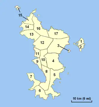 Mayotte is divided into 17 communes. There are also 13 cantons (not shown here). It is the only department and region of France without an arrondissement.