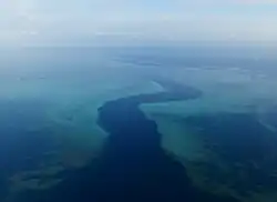 This 160 km (99 mi) long coral reef surrounds a 1,100 km2 (420 sq mi) lagoon, one of the largest and deepest in the world.[11] Part of the barrier reef features a double barrier that is rare on the planet. It protects almost all of Mayotte from ocean currents and waves, except for a dozen passes, including one in the east called the "S-pass". The lagoon, which averages 5 to 10 km (3.1 to 6.2 mi) wide, is up to 100 m (330 ft) deep.