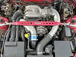The sequential twin-turbocharging system, introduced in 1992, was extremely complex and was developed with the aid of Hitachi. It was previously used on the exclusive-to-Japan Cosmo JC Series. The system used two turbochargers, one to provide 10 psi (0.69 bar) of boost from 1,800 rpm. The second turbocharger activated in the upper half of the rpm range, during full-throttle acceleration – at 4,000 rpm to maintain 10 psi (0.69 bar) until redline.[27] The changeover process occurred at 4,500 rpm, with a momentary dip in pressure to 8 psi (0.55 bar),[28] and provided semi-linear acceleration from a wide torque curve throughout the entire rev range under normal operation.