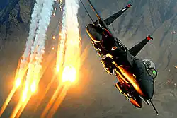 An F-15E of the 391st Expeditionary Fighter Squadron launching heat decoys over Afghanistan, 2008