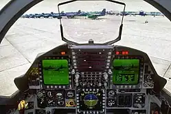 Forward cockpit of an F-15E with three multifunction displays
