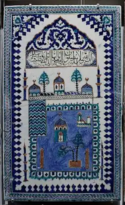 Medina is generally considered to be the "cradle of Islamic culture and civilization".[5] The city is considered to be the second-holiest of three key cities in Islamic tradition, with Mecca and Jerusalem serving as the holiest and third-holiest cities respectively. Al-Masjid al-Nabawi (lit.'The Prophet's Mosque') is of exceptional importance in Islam and serves as burial site of the prophet Muhammad, by whom the mosque was built in 622 CE (first year of the Hijrah). Observant Muslims usually visit his tomb, or rawḍah, at least once in their lifetime during a pilgrimage known as Ziyarat, although this is not obligatory.[6] The original name of the city before the advent of Islam was Yathrib (Arabic: يَثْرِب), and it is referred to by this name in Chapter 33 (Al-Aḥzāb, lit.'The Confederates') of the Quran. It was renamed to Madīnat an-Nabī (lit.'City of the Prophet' or 'The Prophet's City') after and later to al-Madinah al-Munawwarah (lit.'The Enlightened City') before being simplified and shortened to its modern name, Madinah (lit.'The City'), from which the English-language spelling of "Medina" is derived. Saudi road signage uses Madinah and al-Madinah al-Munawwarah interchangeably.[6]