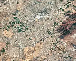 Medina,[a] officially al-Madinah al-Munawwarah,[b] also known as al-Madinah an-Nabawiyyah and Taybah[c] and known in pre-Islamic times as Yathrib,[d] is the capital and administrative centre of Medina Province in the Hejaz region of western Saudi Arabia. It is one of the oldest and most important places in Islamic history. The second holiest city in Islam, the population as of 2022 is 1,477,023, making it the fourth-most populous city in the country. Around 58.5% of the population are Saudi citizens and 41.5% are foreigners.[4] Located at the core of the Medina Province in the western reaches of the country, the city is distributed over 589 km2 (227 sq mi), of which 293 km2 (113 sq mi) constitutes the city's urban area, while the rest is occupied by the Hejaz Mountains, empty valleys, agricultural spaces and older dormant volcanoes.