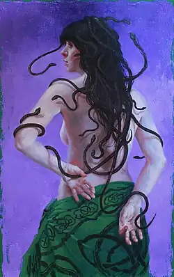 The Medusa story has also been interpreted in contemporary art as a classic case of rape-victim blaming, by the goddess Athena. Inspired by the #metoo movement, contemporary figurative artist Judy Takács returns Medusa's beauty along with a hashtag stigmata in her portrait, #Me(dusa)too.[33]