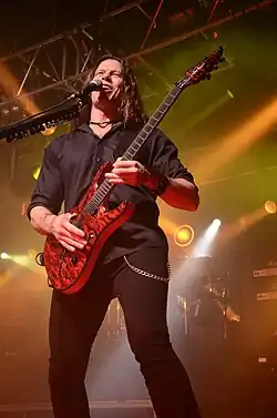 In January 2008, Glen Drover quit Megadeth, stating that he was tired of the frequent touring and wanted to spend more time with his family. He also cited personal issues with other band members.[197] Drover was replaced by Chris Broderick, formerly of Nevermore and Jag Panzer.[198] Broderick was initially asked by Mustaine's management company at the end of 2007 if he would be interested in auditioning for Megadeth. After an informal meeting at Mustaine's house, Broderick was introduced as the band's new guitarist.[199] Mustaine complimented Broderick's playing skills and called him "the best guitarist Megadeth has ever had".[200] Broderick's former Nevermore bandmate, Van Williams, congratulated Megadeth on "getting one hell of a good player, more importantly they're getting a great guy to hang out with and a true friend".[201]