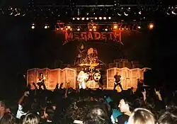 In June 1988, Megadeth appeared in Penelope Spheeris' documentary The Decline of Western Civilization Part II: The Metal Years.[63] The documentary chronicled the Los Angeles heavy metal scene of the late 1980s, and Spheeris, who had directed Megadeth in the video for "Wake Up Dead", decided to include them to feature a more serious band in contrast to the glam metal groups.[64][65] Mustaine remembered the film as a disappointment, as it aligned Megadeth with "a bunch of shit bands".[66]