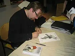 Megatokyo is usually hand-drawn in pencil by Fred Gallagher, without any digital or physical "inking". Inking was originally planned, but dropped as Gallagher decided it was unfeasible.[12] Megatokyo's first strips were created by roughly sketching on large sheets of paper, followed by tracing, scanning, digital clean-up of the traced comics with Adobe Photoshop, and final touches in Adobe Illustrator to achieve a finished product.[13] Gallagher has stated that tracing was necessary because his sketches were not neat enough to use before tracing.[14] Because of the tracing necessary, these comics regularly took six to eight hours to complete.[14] As the comic progressed, Gallagher became able to draw "cleaner" comics without rough lines and tracing lines, and was able to abandon the tracing step. Gallagher believes "that this eventually led to better looking and more expressive comics".[15]