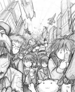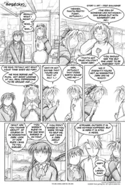 Megatokyo (メガトーキョー; also stylized as MegaTokyo) is an English-language webcomic created by Fred Gallagher and Rodney Caston. Megatokyo debuted on August 14, 2000,[1] and has been written and illustrated solely by Gallagher since June 17, 2002.[2] Gallagher's style of writing and illustration is heavily influenced by Japanese manga. Megatokyo is freely available on its official website. The intended schedule for updates was for postings twice a week, but new comics are typically posted just once or twice a quarter on non-specific days. In 2011, updates began being delayed further due to the health issues of Sarah Gallagher (Seraphim), Gallagher's wife. Megatokyo was published in book-format by CMX, although the first three volumes were published by Dark Horse. For February 2005, sales of the comic's third printed volume were ranked third on BookScan's list of graphic novels sold in bookstores, then the best showing for an original English-language manga.[3]