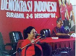 When the congress assembled, the government stalled and delayed attempts to hold the election.[8] The congress faced a deadline when their permit to assemble would run out. As the hours ticked down to the end of the congress, troops began gathering. With only two hours remaining, Megawati Sukarnoputri called a press conference, stating that because she enjoyed the support of a majority of PDI members, she was now the de facto chair.[8] Despite her relative lack of political experience, she was popular in part for her status as Sukarno's daughter and because she was seen as free of corruption with admirable personal qualities. Under her leadership, PDI gained a large following among the urban poor and both urban and rural middle classes.[9]