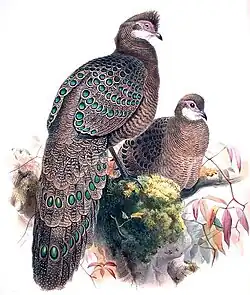 Meghalaya's forests host 660 species of birds, many of which are endemic to Himalayan foothills, Tibet and Southeast Asia. Of the birds found in Meghalaya forests, 34 are on worldwide threatened species list and 9 are on the critically endangered list.[42] Prominent birds spotted in Meghalaya include those from the families of Phasianidae, Anatidae, Podicipedidae, Ciconiidae, Threskiornithidae, Ardeidae, Pelecanidae, Phalacrocoracidae, Anhingidae, Falconidae, Accipitridae, Otididae, Rallidae, Heliornithidae, Gruidae, Turnicidae, Burhinidae, Charadriidae, Glareolidae, Scolopacidae, Jacanidae, Columbidae, Psittacidae, Cuculidae, Strigidae, Caprimulgidae, Apodidae, Alcedinidae, Bucerotidae, Ramphastidae, Picidae, Campephagidae, Dicruridae, Corvidae, Hirundinidae, Cisticolidae, Pycnonotidae, Sylviidae, Timaliidae, Sittidae, Sturnidae, Turdidae, Nectariniidae and Muscicapidae.[42] Each of these families have many species. The great Indian hornbill is the largest bird in Meghalaya. Other regional birds found include the grey peacock pheasant, the large Indian parakeet and the common green pigeon.[51] Meghalaya is also home to over 250 species of butterflies, nearly a quarter of all butterfly species found in India.