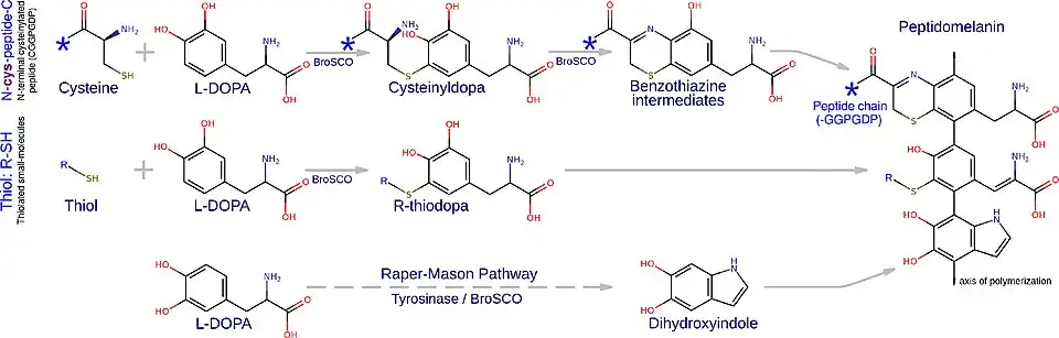 Peptidomelanin is synthesized using a broad-spectrum copper oxidase.[23] This enzyme possesses a type-3 di-copper catalytic centre housed in a large-solvent accessible cavity. This enzyme has been shown to oxidize the thiol groups of cysteinylated peptides, allowing them to copolymerize with an L-DOPA-derived core polymer.