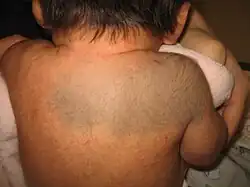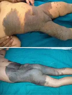 | Mongolian spot | Congenital large, deep, bluish discoloration which generally disappears by puberty. It is named for its association with East Asian ethnic groups but is not limited to them.[23] |