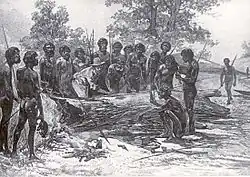 Aboriginal Australians have lived in the Melbourne area for at least 40,000 years.[27] When British colonists arrived in the 19th century, up to 20,000 Kulin people from three distinct language groups – the Wurundjeri, Bunurong and Wathaurong – resided in the area.[28][29] It was an important meeting place for the clans of the Kulin nation alliance and a vital source of food and water.[30][14] In June 2021, the boundaries between the land of two of the traditional owner groups, the Wurundjeri and Bunurong, were agreed after being drawn up by the Victorian Aboriginal Heritage Council. The borderline runs across the city from west to east, with the CBD, Richmond and Hawthorn included in Wurundjeri land, and Albert Park, St Kilda and Caulfield on Bunurong land.[31] However, this change in boundaries is still disputed by people on both sides of the dispute including N'arweet Carolyn Briggs.[32] The name Narrm is commonly used by the broader Aboriginal community to refer to the city, stemming from the traditional name recorded for the area on which the Melbourne city centre is built.[33][10] The word is closely related to Narm-narm, being the Boonwurrung word for Port Phillip Bay.[34] Narrm means scrub in Eastern Kulin languages which reflects the Creation Story of how the Bay was filled by the creation of the Birrarung (Yarra River). Before this, the dry Melbourne region extended out into the Bay and the Bay was filled with teatree scrub where boorrimul (emu) and marram (kangaroo) were hunted.[35][36]