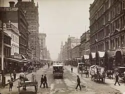 In 1885, visiting English journalist George Augustus Henry Sala & Joe Harold coined the phrase "Marvellous Melbourne", which stuck long into the twentieth century and has come to refer to the opulence and energy of the 1880s,[65] during which time large commercial buildings, grand hotels, banks, coffee palaces, terrace housing and palatial mansions proliferated in the city.[66] The establishment of the Melbourne Hydraulic Power Company in 1886 led to the availability of high-pressure piped water, allowing for the installation of hydraulically powered elevators, which led to the construction of the first high-rise buildings in the city.[67][68] The period also saw the huge expansion of a significant radial rail-based transport network throughout the city and suburbs.[69]