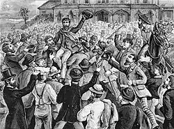 An influx of intercolonial and international migrants, particularly from Europe and China, saw the establishment of slums, including Chinatown and a temporary "tent city" on the southern banks of the Yarra. In the aftermath of the 1854 Eureka Rebellion, mass public support for the plight of the miners resulted in major political changes to the colony, including improvements in working conditions across mining, agriculture, manufacturing and other local industries. At least twenty nationalities took part in the rebellion, giving some indication of immigration flows at the time.[57]