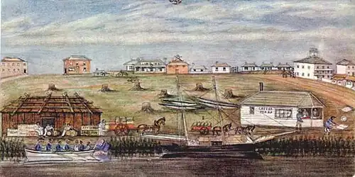 The area of Melbourne has been home to Aboriginal Victorians for over 40,000 years.[13][14] Of the five peoples of the Kulin nation, the traditional custodians of the land encompassing Melbourne are the Boonwurrung, Woiwurrung and the Wurundjeri peoples. In 1803, a short-lived British penal settlement was established at Port Phillip, then part of the Colony of New South Wales. Melbourne was founded in 1835 with the arrival of free settlers from Van Diemen's Land (modern-day Tasmania).[13] It was incorporated as a Crown settlement in 1837, and named after the then-Prime Minister of the United Kingdom, William Lamb, 2nd Viscount Melbourne.[13] Declared a city by Queen Victoria in 1847, it became the capital of the newly separated Colony of Victoria in 1851.[15] During the 1850s Victorian gold rush, the city entered a lengthy boom period that, by the late 1880s, had transformed it into Australia's, and one of the world's, largest and wealthiest metropolises.[16][17] After the federation of Australia in 1901, Melbourne served as the interim seat of government of the new nation until Canberra became the permanent capital in 1927.[18]