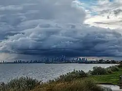 Melbourne has a temperate oceanic climate (Köppen climate classification Cfb), with warm summers and cool winters.[113][114] Melbourne is well known for its changeable weather conditions, mainly due to it being located on the boundary of hot inland areas and the cool southern ocean. This temperature differential is most pronounced in the spring and summer months and can cause strong cold fronts to form. These cold fronts can be responsible for varied forms of severe weather from gales to thunderstorms and hail, large temperature drops and heavy rain. Winters, while exceptionally dry by southern Victorian standards, are nonetheless drizzly and overcast. The lack of winter rainfall is because of Melbourne's rain shadowed location between the Otway and Macedon Ranges, which block much of the rainfall arriving from the north and west.[115]