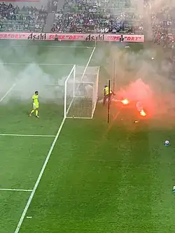 Following the World Cup break, on 12 December 2022, preceding the Christmas Melbourne Derby fixture, the Australian Professional Leagues announced an agreement with Destination NSW that would see the 2023, 2024, and 2025 A-League Men Grand Finals hosted in Sydney, as opposed to the traditional format of being hosted by the finalist that finished higher during the regular season.[99] This announcement was met with widespread opposition from fans. A 20th minute walkout was staged by the former active groups of both clubs, Original Style Melbourne and City Terrace.[100] In the 20th minute, the match was suspended by referee Alex King as flares were thrown onto both sides of the pitch. Tom Glover threw one of a flare back into the crowd of Victory supporters, sparking a pitch invasion where Glover was struck with a metal bucket. Security, a Channel 10 Cameraman, and referee Alex King were also subject to the violence. The pitch invasion forced the Derby's abandonment in the 22nd minute (score being 1–0 to City) due to concerns with player safety.[101]