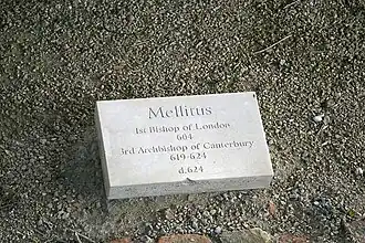 Mellitus died on 24 April 624,[32] and was buried at St Augustine's Abbey in Canterbury that same day.[3] He became revered as a saint after his death, and was allotted the feast day of 24 April.[2] In the ninth century, Mellitus's feast day was mentioned in the Stowe Missal, along with Laurence and Justus.[35] He was still venerated at St Augustine's in 1120, along with a number of other local saints.[36] There was also a shrine to him at Old St Paul's Cathedral in London.[37] Shortly after the Norman Conquest, Goscelin wrote a life of Mellitus, the first of several to appear around that time, but none contain any information not included in Bede's earlier works. These later medieval lives do, however, reveal that during Goscelin's lifetime, persons suffering from gout were urged to pray at Mellitus's tomb.[3] Goscelin records that Mellitus's shrine flanked that of Augustine, along with Laurence, in the eastern central chapel of the presbytery.[38]