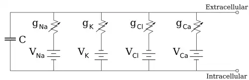 Electrophysiologists model the effects of ionic concentration differences, ion channels, and membrane capacitance in terms of an equivalent circuit, which is intended to represent the electrical properties of a small patch of membrane. The equivalent circuit consists of a capacitor in parallel with four pathways each consisting of a battery in series with a variable conductance. The capacitance is determined by the properties of the lipid bilayer, and is taken to be fixed. Each of the four parallel pathways comes from one of the principal ions, sodium, potassium, chloride, and calcium. The voltage of each ionic pathway is determined by the concentrations of the ion on each side of the membrane; see the Reversal potential section above. The conductance of each ionic pathway at any point in time is determined by the states of all the ion channels that are potentially permeable to that ion, including leakage channels, ligand-gated channels, and voltage-gated ion channels.