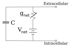 For fixed ion concentrations and fixed values of ion channel conductance, the equivalent circuit can be further reduced, using the Goldman equation as described below, to a circuit containing a capacitance in parallel with a battery and conductance. In electrical terms, this is a type of RC circuit (resistance-capacitance circuit), and its electrical properties are very simple. Starting from any initial state, the current flowing across either the conductance or the capacitance decays with an exponential time course, with a time constant of τ = RC, where C is the capacitance of the membrane patch, and R = 1/gnet is the net resistance. For realistic situations, the time constant usually lies in the 1–100 millisecond range. In most cases, changes in the conductance of ion channels occur on a faster time scale, so an RC circuit is not a good approximation; however, the differential equation used to model a membrane patch is commonly a modified version of the RC circuit equation.