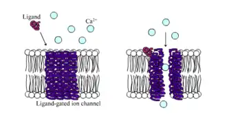 Ion channels can be classified by how they respond to their environment.[22] For example, the ion channels involved in the action potential are voltage-sensitive channels; they open and close in response to the voltage across the membrane. Ligand-gated channels form another important class; these ion channels open and close in response to the binding of a ligand molecule, such as a neurotransmitter. Other ion channels open and close with mechanical forces. Still other ion channels—such as those of sensory neurons—open and close in response to other stimuli, such as light, temperature or pressure.