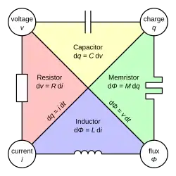 A memristor (/ˈmɛmrɪstər/; a portmanteau of memory resistor) is a non-linear two-terminal electrical component relating electric charge and magnetic flux linkage. It was described and named in 1971 by Leon Chua, completing a theoretical quartet of fundamental electrical components which also comprises the resistor, capacitor and inductor.[1]