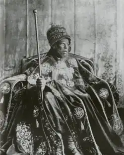 ![]() Photograph of Emperor Menelik II on the throne in coronation garb | |||||