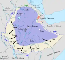 Menelik brought together many of the northern territories through political consensus. The exception was Gojjam, which offered tribute to the Shewan Kingdom following its defeat at the Battle of Embabo.[32] Most of the western and central territories like Jimma, Welega Province and Chebo surrendered to Menelik's invading forces with no resistance.[33] Native armed soldiers of Ras Gobana Dacche, Ras Mikael Ali, Habtegyorgis Dinegde, Balcha Aba Nefso were allied to Menelik's Shewan army which campaigned to the south to incorporate more territories.[34][35][36][37][38][39]