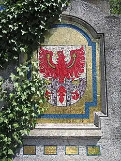 The city's coat of arms depicts the red Tyrolean eagle sitting on a wall with four pieces of Ghibelline battlements and three arches that symbolize the city. The arms is known from the 14th century and the oldest seal dates from 1353, while the coloured one since 1390. In a 1759 image, the eagle is represented with a crown and a green wreath of honour. After World War I and the annexation of the city from Austria-Hungary to Italy, it was given a new coat of arms in 1928, which looked similar to the old one, but with five parts of the battlements and the arches with the gates opened on a lawn of shamrock. A mural crown was placed above the shield.[9] The five parts of the battlement represented the districts of Maia Bassa, Merano (old city), Maia Alta, Quarazze and Avelengo, which were incorporated into the city by the Italian fascists.[10] After World War II, Avelengo became independent again and the historical coat of arms was restored.[11][12]