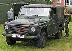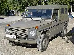 The G-class was developed as a military vehicle from a suggestion by the Shah of Iran Mohammad Reza Pahlavi to Mercedes[9] and was later offered as a civilian vehicle in 1979. In this military role the vehicle was sometimes referred to as the "Wolf". The Peugeot P4 was a variant made under licence in France with a Peugeot engine. The first military in the world to use it was the Argentine Army (Ejército Argentino) beginning in 1981 with the military model 461, at least one of these was captured in the Falklands and subsequently served with the Royal Air Force.[10]
