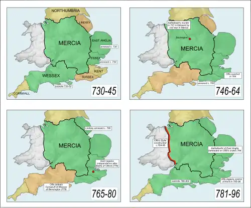 For the three centuries between 600 and 900, known as Mercian Supremacy or the "Golden Age of Mercia", having annexed or gained submissions from five of the other six kingdoms of the Heptarchy (East Anglia, Essex, Kent, Sussex and Wessex), Mercia dominated England south of the Humber estuary. During King Offa's reign, a dyke was created as the boundary between Mercia and the Welsh kingdoms. Nicholas Brooks noted that "the Mercians stand out as by far the most successful of the various early Anglo-Saxon peoples until the later ninth century",[4] and some historians, such as Sir Frank Stenton, believe the unification of England south of the Humber estuary was achieved during Offa's reign.[5]