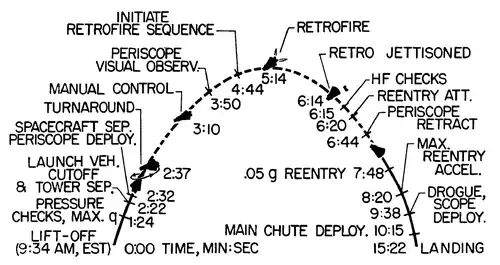 | 15:22 | Splashdown | Spacecraft lands in water about 300 mi (480 km) downrange from launch site. |