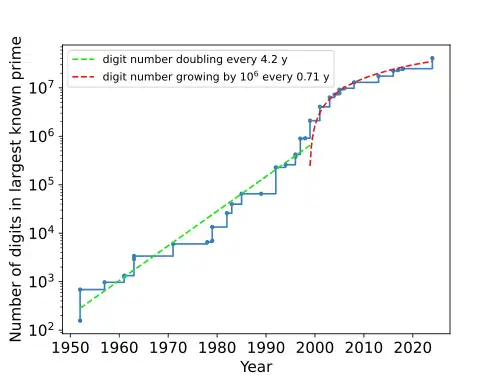 Graph of number of digits in largest known Mersenne prime by year – electronic era. The vertical scale is logarithmic in the number of digits, thus being a function in the value of the prime.