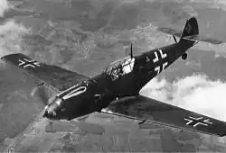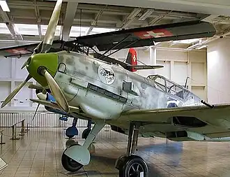 The Messerschmitt Bf 109 is a monoplane fighter aircraft that was designed and initially produced by the German aircraft manufacturer Bayerische Flugzeugwerke (BFW). Together with the Focke-Wulf Fw 190, the Bf 109 formed the backbone of the Luftwaffe's fighter force during the Second World War.[3] It was commonly called the Me 109 by Allied aircrew and some German aces/pilots, even though this was not the official model designation.[4]