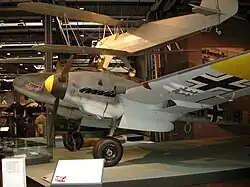 Although the Me 210 entered service in mid-1941, it was plagued with problems and was withdrawn from service for further development.[32][33] In the wake of the failure of the Me 210, the Bf 110G was designed.[34][35] The G model was fitted with DB 605B engines, producing 1,085 kW (1,475 PS) at their Notleistung (war emergency) top-level setting, and 997 kW (1,355 PS) at 5.8 km (19,000 ft) altitude. The Bf 110G also had upgraded nose armament, and underwent some changes which improved the aerodynamics of the aircraft.[36] The rear cockpit access was moved forward from the transversely hinged, "tilt-open" rearmost canopy glazing to a side/top hinged opening section of the main canopy, opening to port, with a new rearmost framed glazing section fixed in place. No Bf 110 G-1 existed, so the Bf 110 G-2 became the baseline Bf 110G. A large number of Rüstsätze field conversion packs were available, making the G subtype the most versatile production version of the Bf 110.