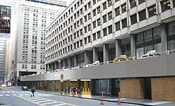 The facade of the first two stories and mezzanines is clad with granite, aluminum, marble, and stainless steel with glass windows.[22] On Depew Place, an alley running below the eastern leg of the Park Avenue Viaduct, fifteen loading docks were constructed for trucks to conduct deliveries and loading.[32][33] On the Vanderbilt Avenue side, a marquee was installed over the entrance in the 1980s.[34] The third through seventh stories are exclusively sheathed in granite, with window inserts.[22][35] The eighth and ninth floors, which are slightly set back, are clad in aluminum.[22][35][36]