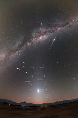 Eta Aquariids meteor shower, with zodiacal light and planets marked and labeled