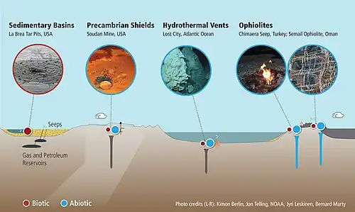 - ^ Kietäväinen and Purkamo (2015). "The origin, source, and cycling of methane in deep crystalline rock biosphere". Front. Microbiol. 6: 725. Bibcode:2015FrMic...600725K. doi:10.3389/fmicb.2015.00725. PMC 4505394. PMID 26236303.