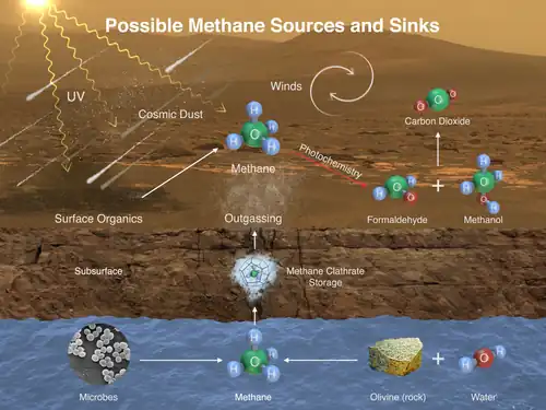 - ^ Atreya, Sushil K.; Mahaffy, Paul R.; Wong, Ah-San (2007). "Methane and related trace species on Mars: origin, loss, implications for life, and habitability". Planetary and Space Science. 55 (3): 358–369. Bibcode:2007P&SS...55..358A. doi:10.1016/j.pss.2006.02.005. hdl:2027.42/151840.