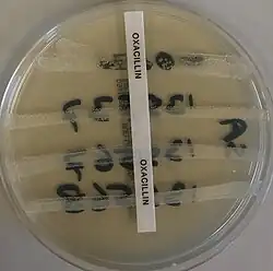 Another common laboratory test is a rapid latex agglutination test that detects the PBP2a protein. PBP2a is a variant penicillin-binding protein that imparts the ability of S. aureus to be resistant to oxacillin.[69]