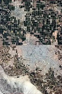 In the mid-19th century, a geologist working for the Southern Pacific Railroad came to the delta area, discovering what the native Yumans had known for centuries: that the thick river sediment deposits made the area prime farming land. These sediments extended far to the west of the river itself, accumulating in a shallow basin below the Sierra de Cucapá.[7] However, from this time period until the 1880s, the area was almost completely unpopulated, mostly due to its harsh climate. In 1888, the federal government granted a large part of northern Baja California state, including Mexicali, to Guillermo Andrade, with the purpose of colonizing the area on the recently created border with the United States. However, around 1900, the only area with any real population, aside from the Cocopah, were concentrated in Los Algodones, to the east of Mexicali.[9]