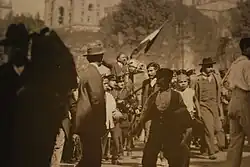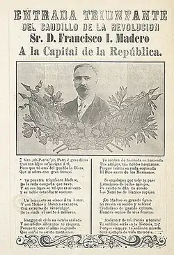 Although the decades-long regime of President Porfirio Díaz (1876–1911) was increasingly unpopular, there was no foreboding in 1910 that a revolution was about to break out.[12] The aging Díaz failed to find a controlled solution to presidential succession, resulting in a power struggle among competing elites and the middle classes, which occurred during a period of intense labor unrest, exemplified by the Cananea and Río Blanco strikes.[14] When wealthy northern landowner Francisco I. Madero challenged Díaz in the 1910 presidential election and Díaz jailed him, Madero called for an armed uprising against Díaz in the Plan of San Luis Potosí. Rebellions broke out first in Morelos (immediately south of the nation's capital city) and then to a much greater extent in northern Mexico. The Federal Army could not suppress the widespread uprisings, showing the military's weakness and encouraging the rebels.[15] Díaz resigned in May 1911 and went into exile, an interim government was installed until elections could be held, the Federal Army was retained, and revolutionary forces demobilized. The first phase of the Revolution was relatively bloodless and short-lived.