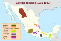 Upon taking power, Huerta had moved swiftly to consolidate his hold in the North, having learned the lesson from Díaz's fall that the north was a crucial region to hold. Within a month of the coup, rebellions began to spread throughout Mexico, most prominently led by the governor of the state of Coahuila, Venustiano Carranza, along with Pablo González. Huerta expected state governors to fall into line with the new government. But Carranza and Abraham González, Governor of Chihuahua did not. Carranza issued the Plan of Guadalupe, a strictly political plan to reject the legitimacy of the Huerta government, and called on revolutionaries to take up arms. Revolutionaries who had brought Madero to power only to be dismissed in favor of the Federal Army eagerly responded to the call, most prominently Pancho Villa. Alvaro Obregón of Sonora, a successful rancher and businessman who had not participated in the Madero revolution, now joined the revolutionary forces in the north, the Constitutionalist Army under the Primer Jefe ("First Chief") Venustiano Carranza. Huerta had Governor González arrested and murdered, for fear he would foment rebellion.[80] When northern General Pancho Villa became governor of Chihuahua in 1914, following the defeat of Huerta, he located González's bones and had them reburied with full honors. In Morelos, Emiliano Zapata continued his rebellion under the Plan of Ayala (while expunging the name of counter-revolutionary Pascual Orozco from it), calling for the expropriation of land and redistribution to peasants. Huerta offered peace to Zapata, who rejected it.[82] The Huerta government was thus challenged by revolutionary forces in the north of Mexico and the strategic state of Morelos, just south of the capital.