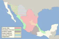 The Mexican Revolution (Spanish: Revolución mexicana) was an extended sequence of armed regional conflicts in Mexico from 20 November 1910 to 1 December 1920.[6][7][8] It has been called "the defining event of modern Mexican history".[9] It saw the destruction of the Federal Army, its replacement by a revolutionary army,[10] and the transformation of Mexican culture and government. The northern Constitutionalist faction prevailed on the battlefield and drafted the present-day Constitution of Mexico, which aimed to create a strong central government. Revolutionary generals held power from 1920 to 1940.[8][11] The revolutionary conflict was primarily a civil war, but foreign powers, having important economic and strategic interests in Mexico, figured in the outcome of Mexico's power struggles; the U.S. involvement was particularly high.[12][13] The conflict led to the deaths of around one million people, mostly non-combatants.