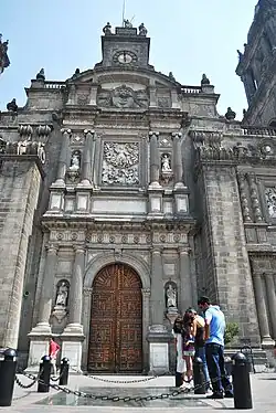 The main facade of the cathedral faces south. The main portal is centered in the main facade and is the highest of the cathedral's three portals. Statues of Saint Peter and Paul the Apostle stand between the columns of the portal, while Saint Andrew and James the Just are depicted on the secondary doorway. In the center of this doorway is a high relief of the Assumption of the Virgin Mary, to whom the cathedral is dedicated.[3] This image is flanked by images of Saint Matthew and Saint Andrew. The coat of arms of Mexico is above the doorway, with the eagle's wings outstretched. There is a clock tower at the very top of the portal with statues representing Faith, Hope and Charity, which was created by sculptor Manuel Tolsá.[13]