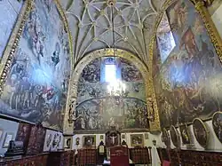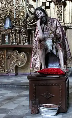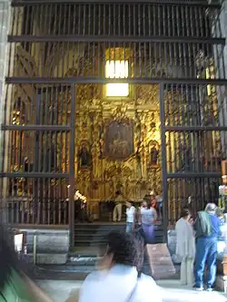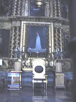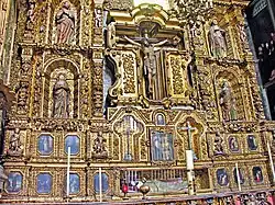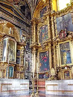 Additional sculptures were created by Sebastián de Santiago.[34] It takes its name from the statues of saintly royalty which form part of its decoration,[3] and is the oldest work in churrigueresque style in Mexico, taking 19 years to complete. At the bottom, from left to right, are six female royal saints: Saint Margaret of Scotland, Helena of Constantinople, Elisabeth of Hungary, Elizabeth of Aragon, Empress Cunegunda and Edith of Wilton.[35] In the middle of the altar are six canonized kings: Hermenegild, a Visigoth martyr; Henry II, Holy Roman Emperor; Edward the Confessor; and Casimir of Poland below, and Saints Louis of France and Ferdinand III of Castile above them. In between these kings an oil painting of the Adoration of the Magi by Juan Rodriguez Juarez shows Jesus as the King of kings. The top portion features a painting of the Assumption of Mary as celestial queen flanked by oval bas reliefs, one of Saint Joseph carrying the infant Jesus and the other of Saint Teresa of Ávila with a quill in her hand and the Holy Spirit above her, inspiring her to write.[36] In the upper part above this, there are angels carrying the attributes of the Virgin Mary such as the Sealed Fountain, the House of Gold, the Well of Living Water, and the Tower of David, and at the top is an image of God, the Father.[31]