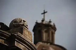 The Crypt of the Archbishops is located below the floor of the cathedral beneath the Altar of the Kings. The entrance to the crypt from the cathedral is guarded by a large wooden door behind which descends a winding yellow staircase. Just past the inner entrance is a Mexica-style stone skull. It was incorporated as an offering into the base of a cenotaph to Juan de Zumárraga, the first archbishop of Mexico. Zumárraga was considered to be a benefactor of the Indians, protecting them against the abuses of their Spanish overlords. There is also a natural-sized sculpture of the archbishop atop the cenotaph.